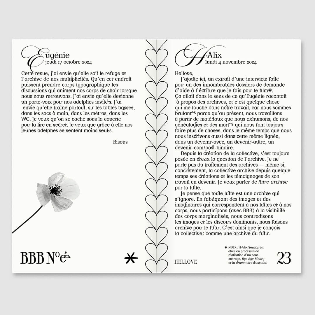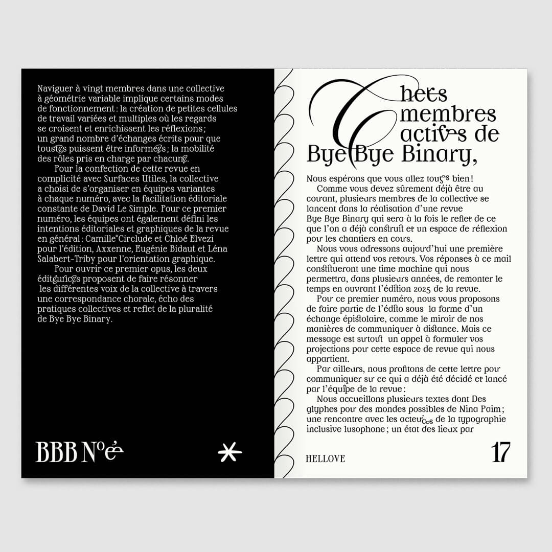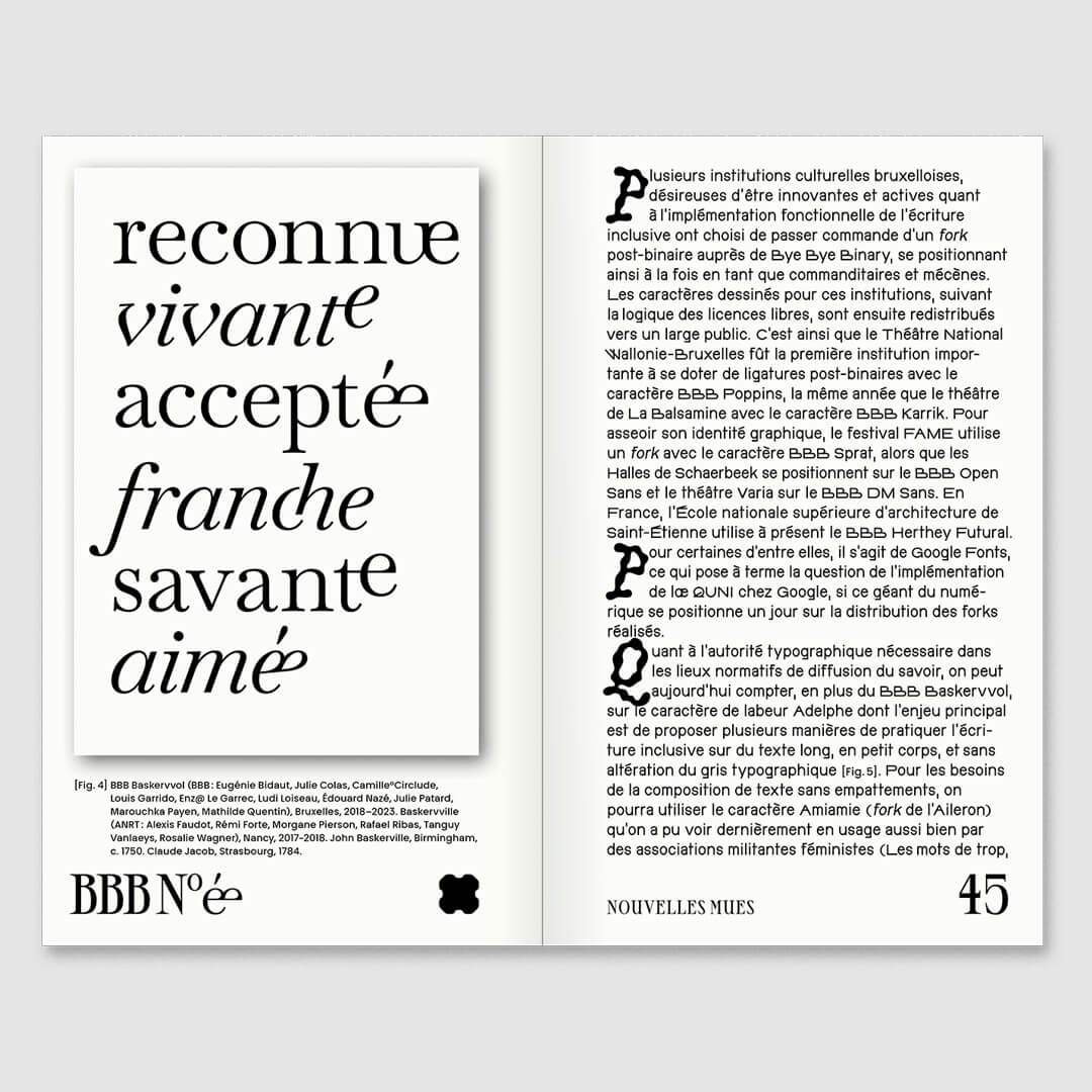 Bye Bye Binary is a Franco-Belgian collective that explores new typo-graphic forms adapted to the French language, using inclusive and post-binary language and writing as a starting point, ground for experimentation and subject for research, in particular through the design of typefaces, the creation of ligatures, median points, linking elements and symbiosis.