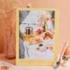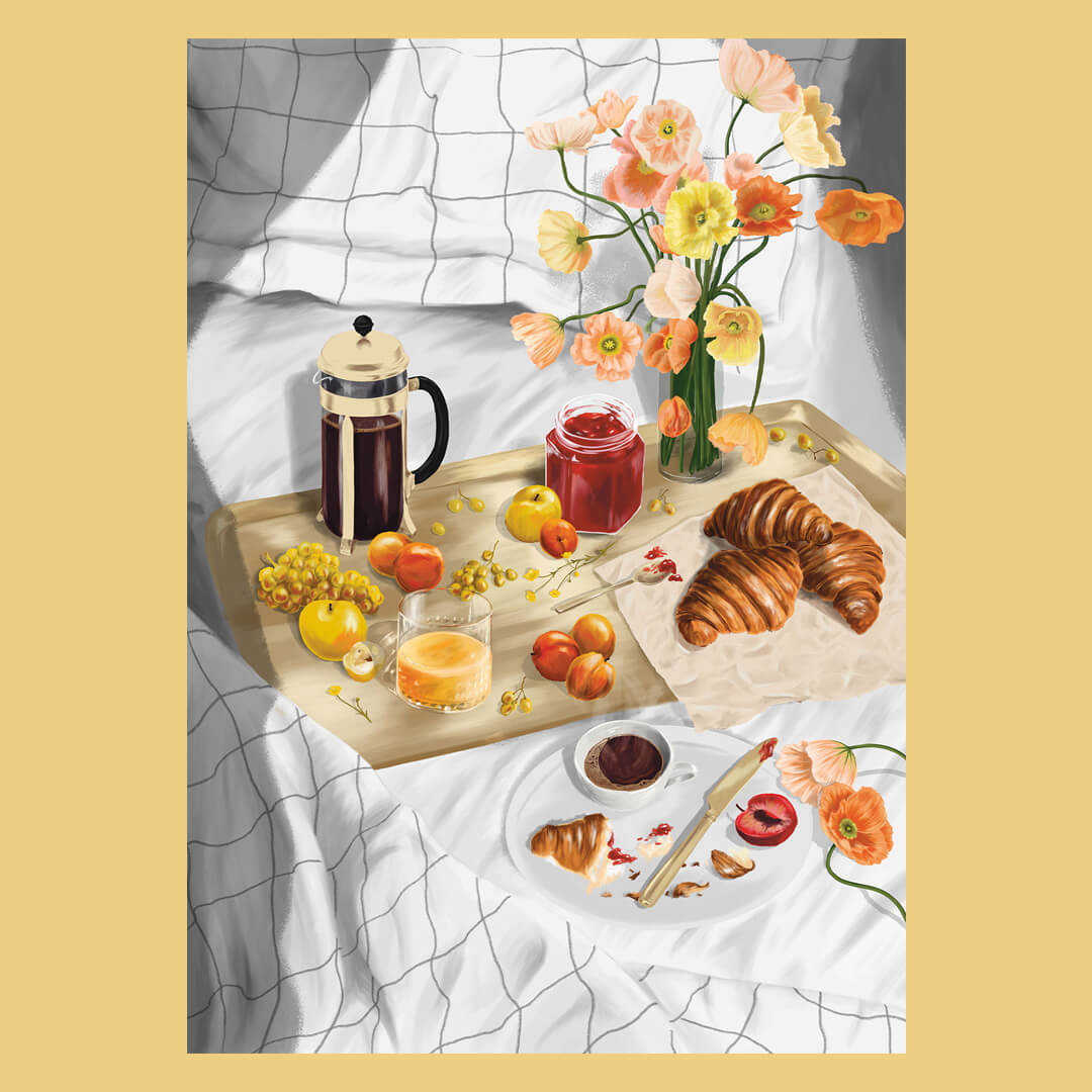 Simply breakfast in bed! A crisp September morning, bathed in light. Between the various elements of the golden tray and the white sheets, it’s a good compromise between pleasure and challenge.