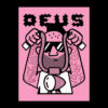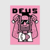 Bold poster on a pink background featuring a stylized figure with sunglasses, tattoos, and raised fists holding laces. The word “DEUS” dominates the top in a striking gothic font.
