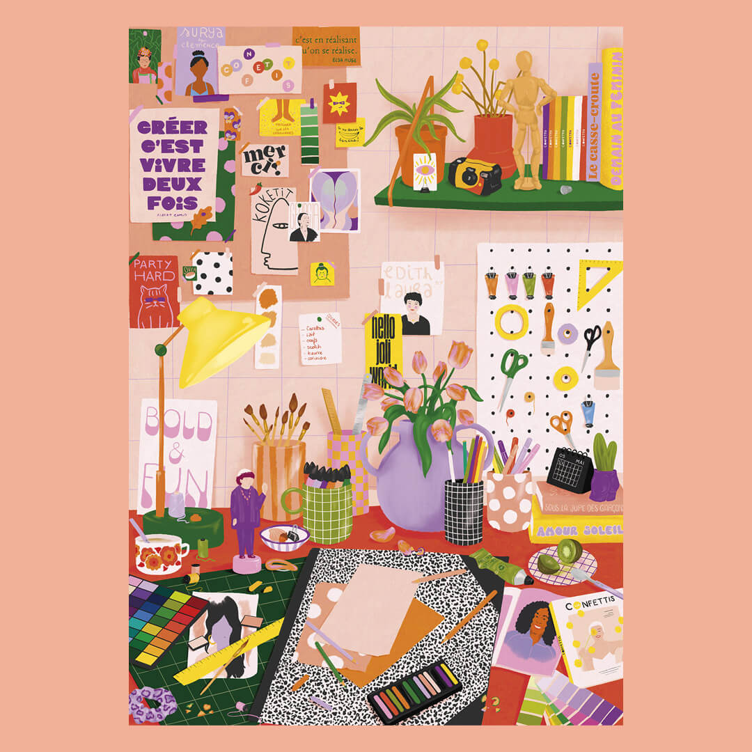 We dream of this inspiring office with a thousand colors, pencils, paints, papers and patterns! Here, we paint, decorate, cut and dream. Assembling this 500-piece puzzle will be a real pleasure! From room to room, will you be able to recognize the references to these inspiring women artists?