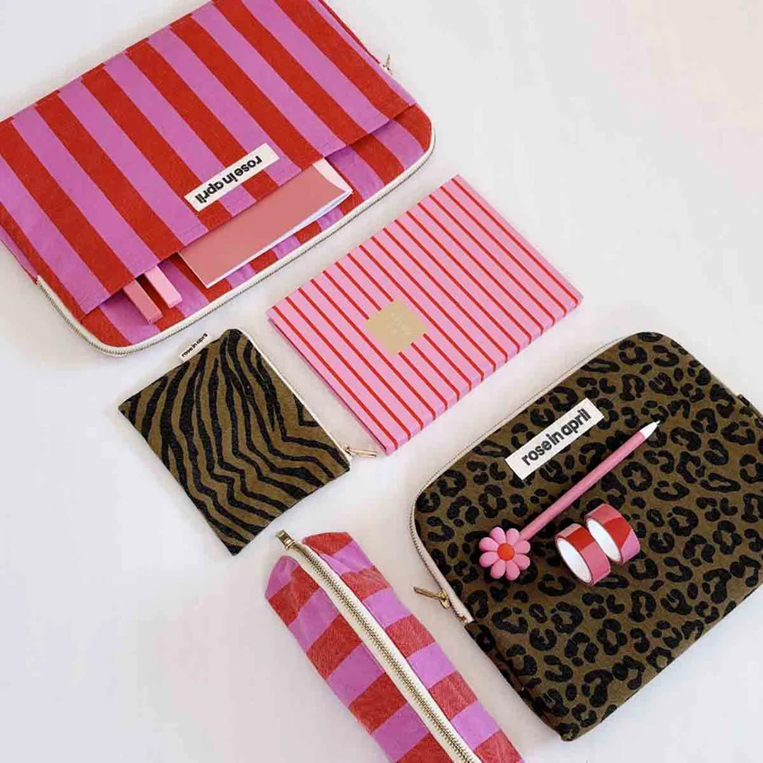 Padded to protect your laptop, our Octave laptop sleeve is perfect for all your projects, whether at work, on the road or at home.Its little plus: an external pocket for your documents, glasses, charger, etc.Leopard, zebra or stripes…the hardest part will be choosing your favorite print! Made in Portugal, our Octave laptop sleeve is made from cotton canvas, a durable and resistant material. Suitable for 13“ and 14” computers. We invite you to check the dimensions of your computer, as they may vary depending on the model and generation. And to ensure a good fit and protect your computer, it is best to leave a small margin inside the sleeve.