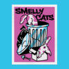 Two cats rummage through a trash can surrounded by garbage. A vivid pink background and comic-like shading highlight the fun, cheeky atmosphere of this poster.