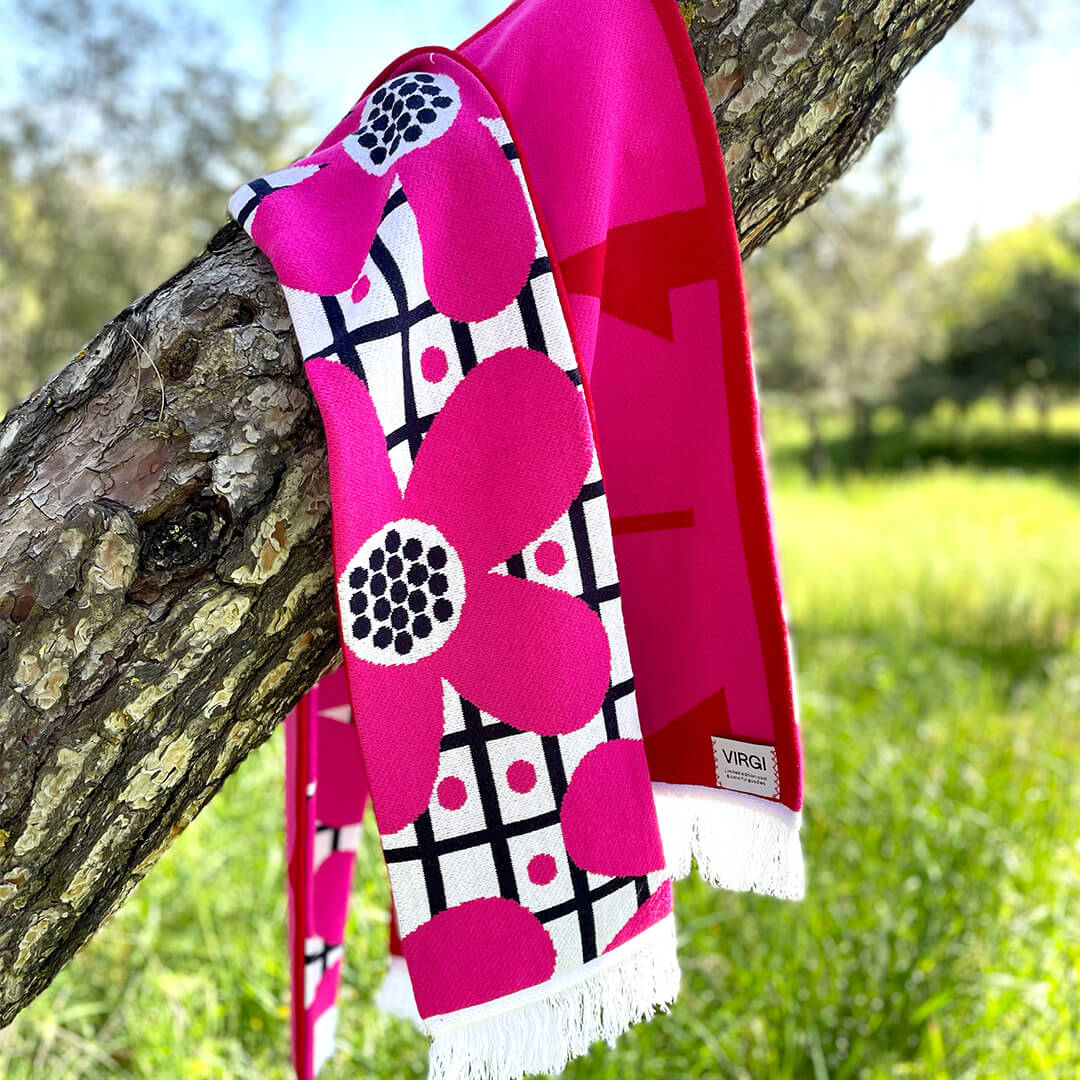 Embrace playful sophistication with our Virgi scarf! One side blooms with vibrant flowers, while the other boasts fun geometric typography. Handcrafted with love, it’s the perfect accessory for adding a pop of personality to any outfit.